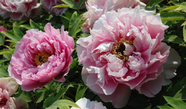 这个品种的牡丹很像康乃馨的颜色,不过她们却个个都有碗口那么大。垂着脸庞,像是一个有着美色的女孩带着一份羞涩一般。